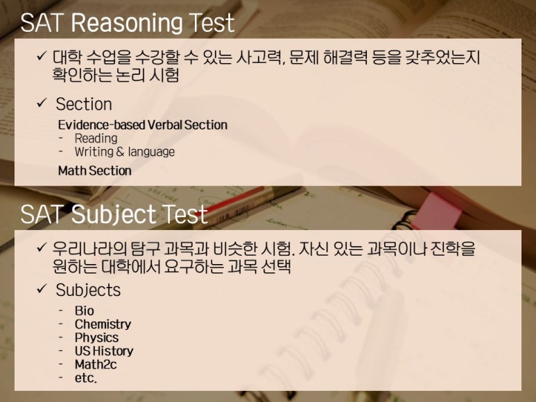 SAT Reasoning Test는 말 그대로 대학에서 공부할 수 있는 정도의 사고력, 문제 해결력 등을 갖추었는지 확인하는 논리력 시험이고, SAT Subject Test는 우리나라 수능의 사탐, 과탐 과목이라고 생각하면 됩니다.