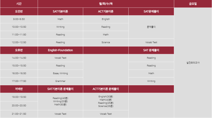 * 수업 시간표에 안내된, SAT/ACT 문제 풀이 및 단어시험 시간은