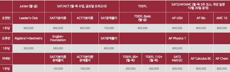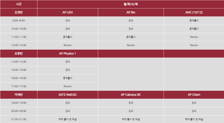 예를 들어, 오전(09:00 AM - 12:50 PM)에는 SAT 기본이론 반을 수강하고,