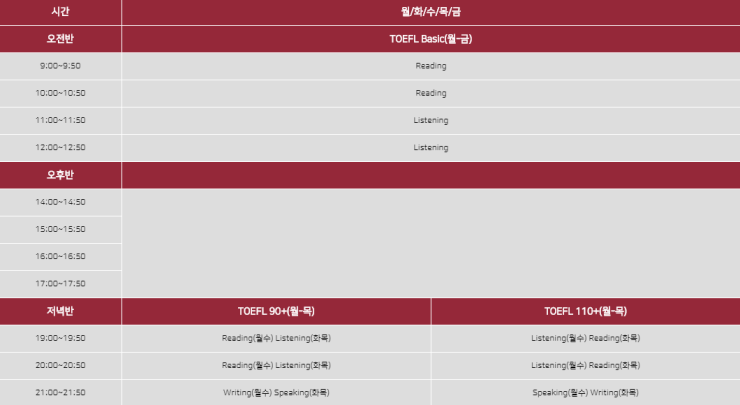 먼저, 오전에만 열리는 TOEFL BASIC 반이 있어요.