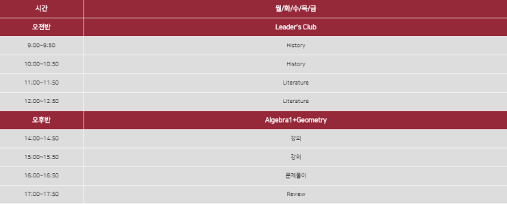 Leader's Club은 주 5일 (월-금) 수업으로 이루어져 있어요.