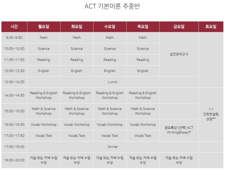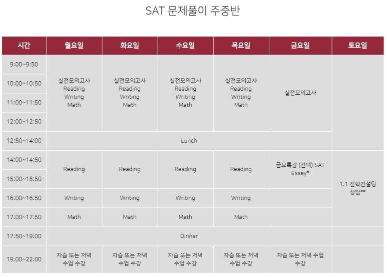 문제풀이반은 실제 시험처럼 타이머를 사용하면서 문제를 풀고 4교시동안 풀었던 문제에 대해 리뷰를 해주는 방식으로 수업이 진행됩니다. 정해진 시간에 맞춰서 문제를 풀고 하루에 1회분을 1~2시간안에 전부 리뷰하기 때문에 SAT,ACT 준비 유경험자 / SAT 총점 1200~1300점이상 / ACT 기본 Composite 27~28점 이상 / 실제시험을 앞두고 있는 학생에게 권장드립니다.