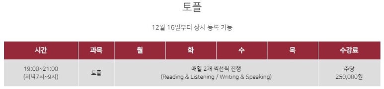 토플수업은 월요일과 수요일에는 Reading&Listening을 화요일과 목요일에는 Writing&Speaking, 일주일에 총 8시간으로 진행됩니다. 토플점수는 학생들이 생각하는 것에 비해 쉽게 빨리 오르는편이 아니기 때문에 미리 준비하는 것을 권장드립니다.