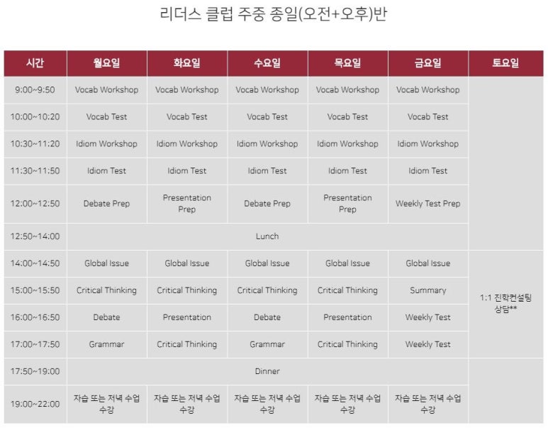 리더스 클럽은 근래에 국제적으로 발생했던 주요사건들을 다루며 다양한 사고를 요하는 문제들을 공부하고 글쓰기와 토론 및 발표로 수업이 진행됩니다. 독해부터 작문,말하기까지 다른 수업과의 시너지효과를 준다는 점에서 향후 GDA및 SAT,ACT,AP 시험을 볼 때 우수한 결과를 얻는 것을 목표로 하는 8~9학년뿐만 아니라 당장 SAT준비계획이 없거나 영어위주의 수업을 듣고 싶고 사회적 배경지식을 배우고 싶은 10학년 학생들에게 권장드립니다.