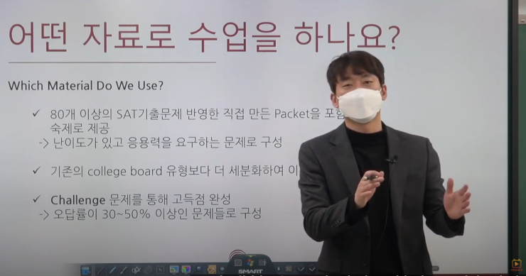 80개 이상의 실제 SAT 기출문제를 기초로 한 선생님의 직접 제작 Packet으로 수업이 진행되며,
