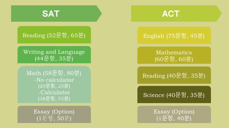 한편 ACT는 English, Math, Reading 그리고 Science Reasoning 이 추가된